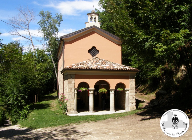 chiesa di S. Lorenzo a Montecuccolo ed i pannelli dal n°19 al n°31 esposti presso la Torre Montecuccoli di Montecenere di Lama Mocogno.