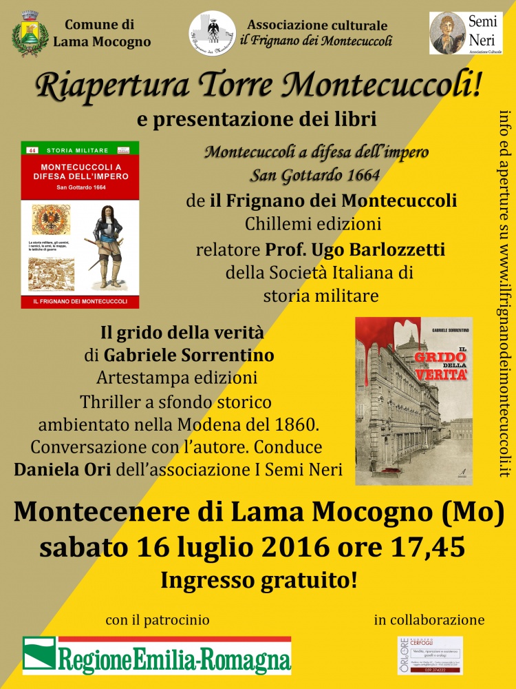Riapertura dell'esposizione alla Torre Montecuccoli di Montecenere e presentazione dei libri "Montecuccoli a difesa dell'impero- San Gottardo 1664" de il Frignano dei Montecuccoli, e "Il grido della verità" di Gabriele Sorrentino.