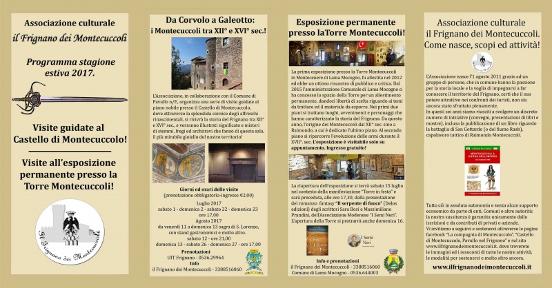 Dal 1° luglio al 27 agosto una serie di 9 visite guidate al Castello di Montecuccolo (la data del 6 agosto non compare nel pieghevole perché aggiunta in seguito alle numerose richieste) a cura del socio Alessio Bononcini che, con l’ausilio di alcuni pannelli descrittivi, ha illustrato le origini della famiglia Montecuccoli sino al XVI° sec., con una ottima presenza di pubblico, che in alcuni casi ha reso neccesaria una seconda visita nel medesimo giorno.